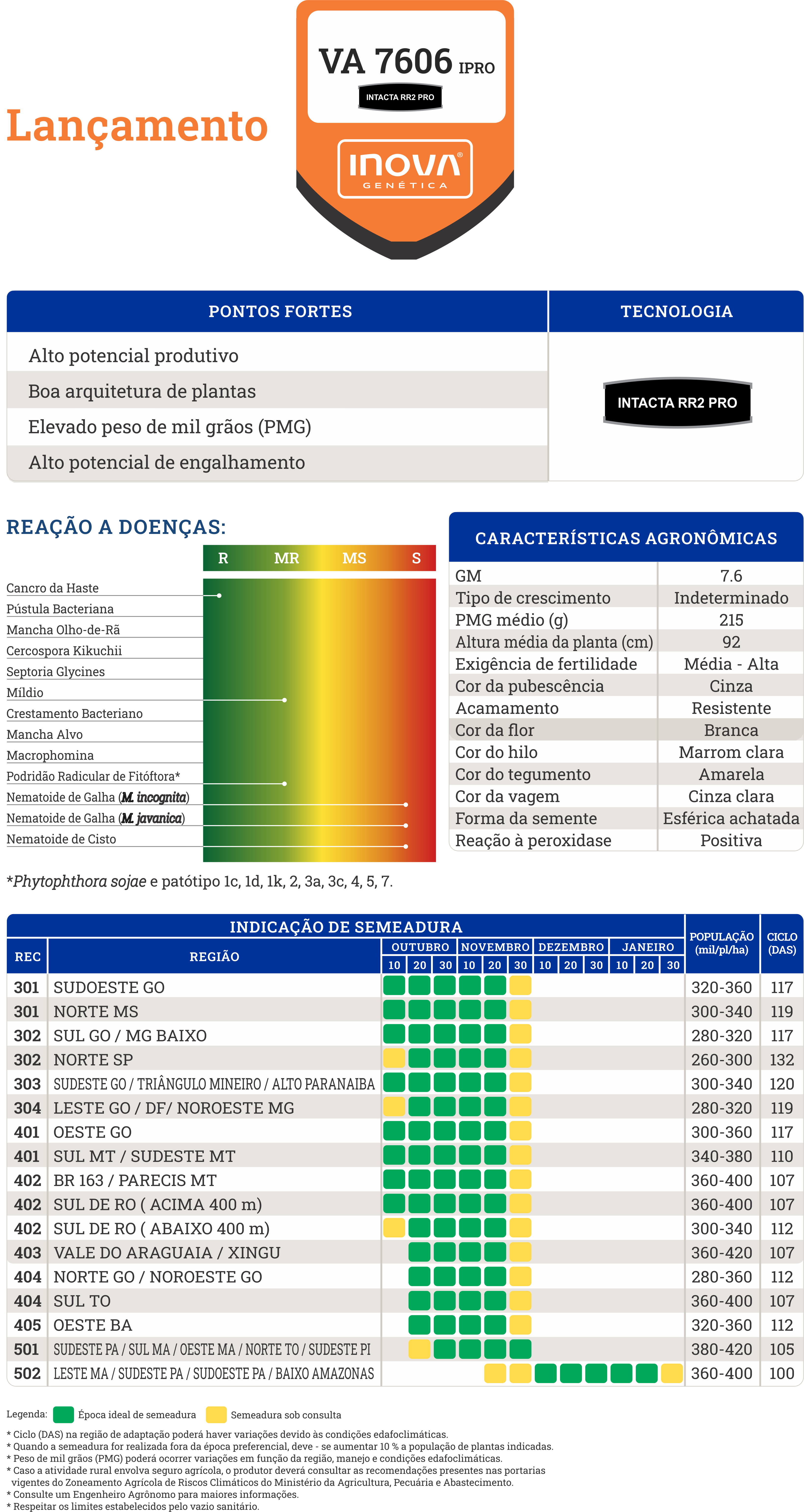 *Ciclo (DAS) na região de adaptação poderá haver variações devido às condições edafoclimáticas.